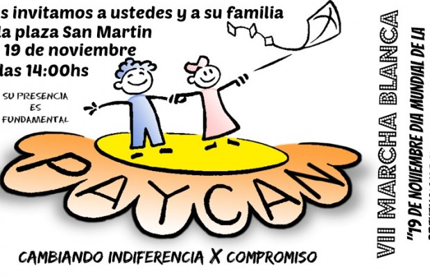 La ONG PAYCAN (Prevenir Ayudar y Contener a la Niñez) invita a toda la comunidad en general a sumarse a la actividad anual denominada “VII MARCHA BLANCA” en el marco del 19 de noviembre “Dia Mundial de la Prevención del Abuso Infantil”, que se llevará a cabo el día Martes 19 del corriente mes a partir de las 14.00 hrs., lugar de encuentro Plaza San Martin.