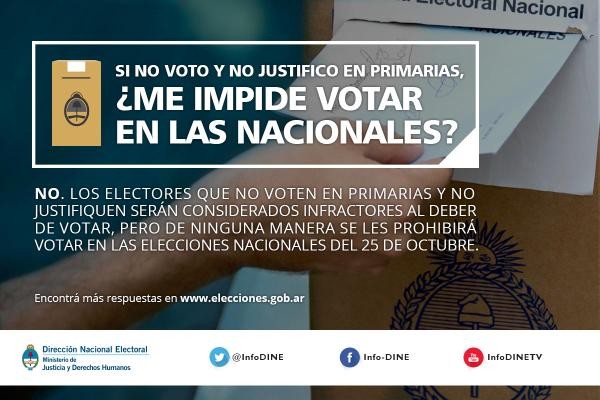 “Si no votaste en las PASO y no justificás, serás infractor al deber de votar pero no se te impedirá votar en nacionales”, según informó la Dirección Nacional Electoral (Dine) a través de las redes sociales Twitter y Facebook, luego de que en las primarias del domingo se registrara el mayor nivel de ausentismo en 32 años de democracia.