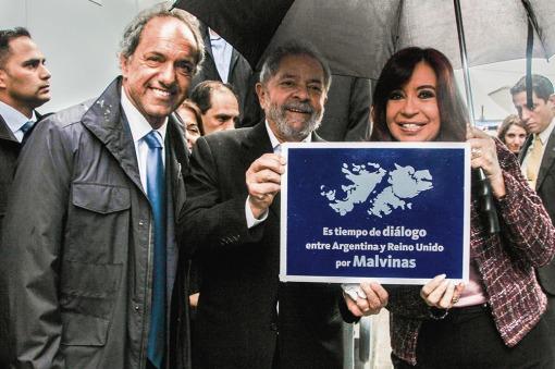 “Es tiempo de diálogo entre Argentina y Reino Unido por Malvinas”, es la frase completa del cartel que sostuvo Lula en la fotografía que se tomó junto a la presidenta Cristina Fernández de Kirchner y el gobernador bonaerense y candidato presidencial, Daniel Scioli, tras participar de la inauguración de una Unidad de Pronta Atención (UPA), en José C. Paz.