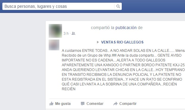 Específicamente estos mensajes aclaran que los siguientes vehículos, un Volkswagen Gol, una Renault Kangoo (bordó) y una Peugeot Partner serían los rodados manejados en los cuales personas no identificadas intentarían “levantar” mujeres que circulan solas en las calles de la ciudad.