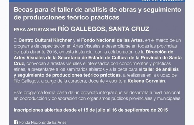 El Área de Artes Visuales de la Secretaría de Estado de Cultura de la Provincia informa a la comunidad en general que hasta el 16 de septiembre próximo se extiende el plazo de inscripción para la beca de “Taller de Análisis de Obras y Seguimiento de Producciones Teórico Prácticas” a cargo de la curadora, docente y escritora Kekena Corvalán. Los interesados podrán recabar información e incluso inscribirse a través de artesvisualesfna@fnartes.gov.ar