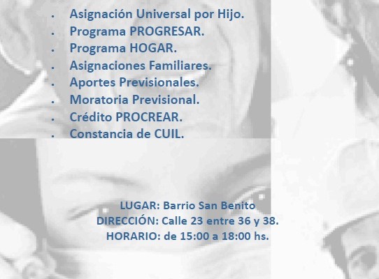 Desde las 15:00 hasta las 18:00 horas, personal de la ANSES brindará atención en la calle 23 entre 36 y 38 del barrio San Benito en donde los beneficiarios podrás realizar los siguientes trámites o consultas: Asignación Universal por Hijo, Programa PROGRESAR, Programa HOGAR, Asignaciones Familiares, Aportes Previsionales, Moratoria Previsional, Crédito PROCREAR y Constancia de CUIL.