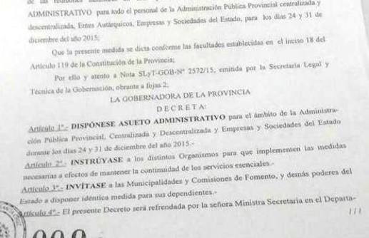 Con la firma de la gobernadora Alicia Kirchner y la Ministro Secretaria General de la Gobernación Claudia Martínez, se conocieron los decretos 096/15 fijando asueto administrativo para el 24 y el 31 de diciembre por las fiestas. También rubricaron el decreto 097/15 estableciendo el receso anual administrativo para todo el mes de enero del 2016 para todos los trabajadores de la administración pública provincial.