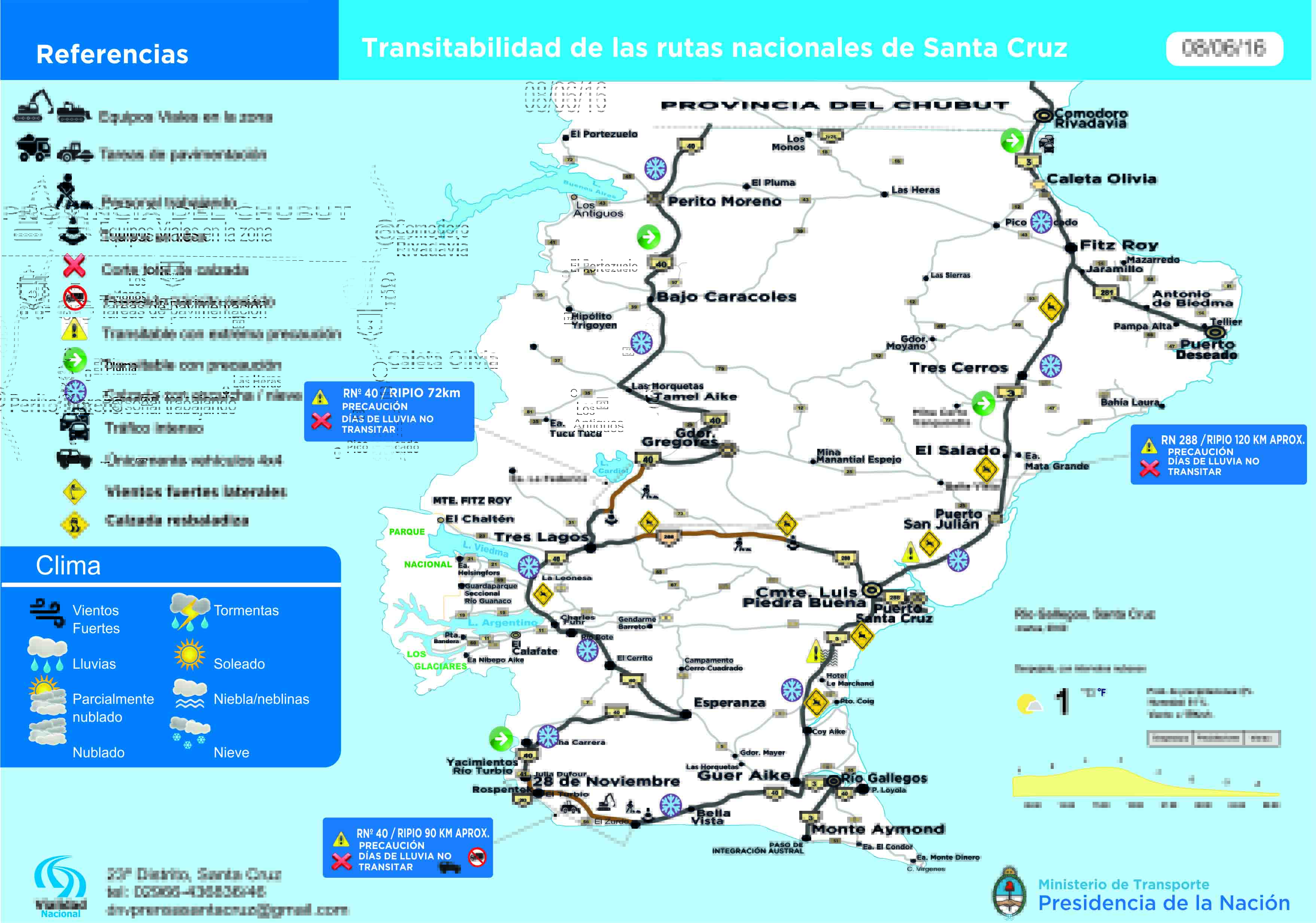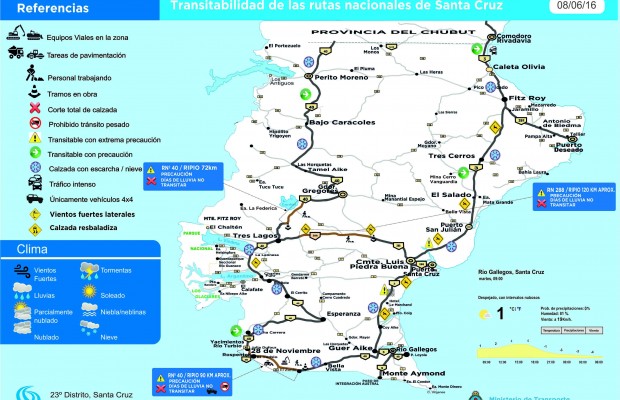 La Dirección Nacional de Vialidad difundió un parte diario de transitabilidad de las rutas nacionales en la provincia de Santa Cruz. Se hace hincapié en el tramo Río gallegos – Lemarchand, Ruta Nacional Nº3, ya que se encuentra con sectores con escarcha en la calzada.