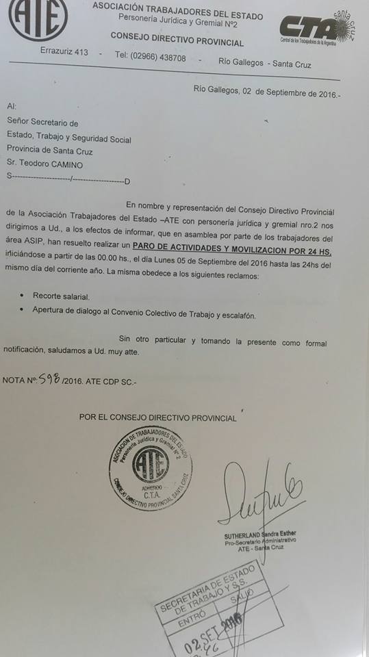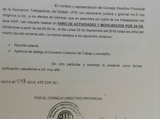 La Asociación de Trabajadores del Estado informó a la Secretaría de Estado de Trabajo, que los trabajadores de la flamante Agencia Santacruceña de Ingresos Públicos, realizarán esta medida de fuerza este lunes 5 de septiembre, luego de decidirlo en asamblea.