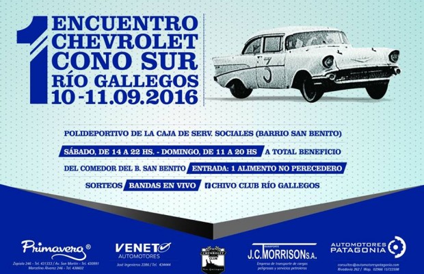 Bajo la Organización del Chevrolet Club Rio gallegos, se realizara e 1º Encuentro Chevrolet Cono Sur, el cual se desarrollara en las instalaciones del Polideportivo de la Mutual de la Caja de Servicios sociales emplazado en el Barrio San Benito durante los días 10 Y 11 del corriente.