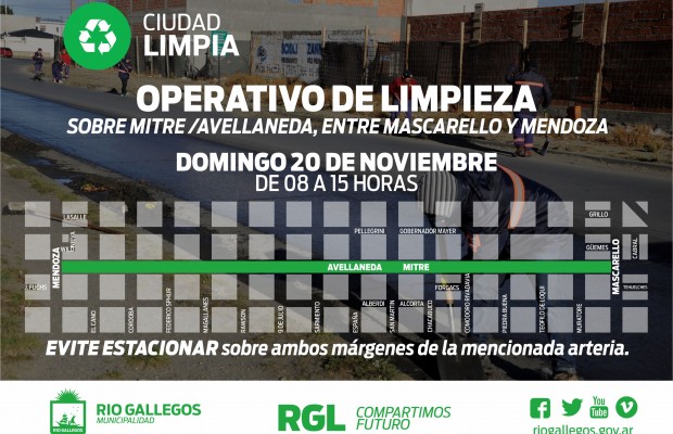 La Secretaria de Obras Públicas de la Municipalidad de Río Gallegos, informa a los contribuyentes que el domingo 20 del corriente, entre las 8 y las 15 horas, se llevará adelante un operativo de limpieza sobre la calle Avellaneda entre las calles Mendoza y Mascarello.