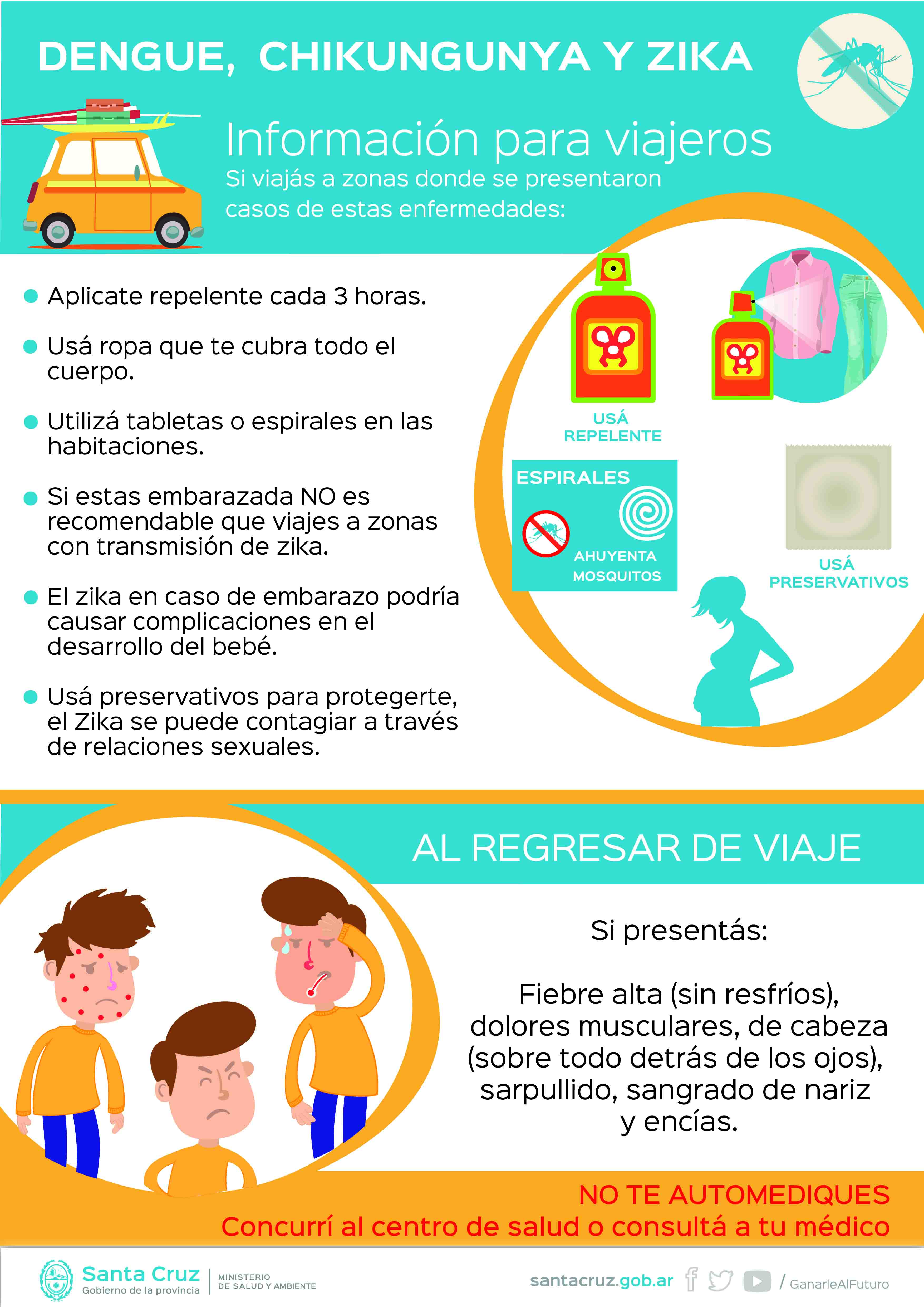 Con motivo del desplazamiento de viajeros que se espera por las vacaciones de verano, el Ministerio de Salud y Ambiente recuerda adoptar medidas especiales para evitar la picadura del mosquito Aedes aegypti. Además, solicita acudir al médico y no automedicarse ante la aparición de síntomas como fiebre, manchas en la piel, náuseas, vómitos y diarrea, dolor intenso de cabeza y ojos, dolor en las articulaciones, entre otros.