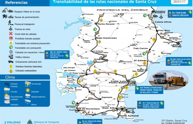 Ruta Nacional Nº 3 Ramón Santos – Caleta Olivia Transitable c/precaución, baches, deformaciones de calzada.