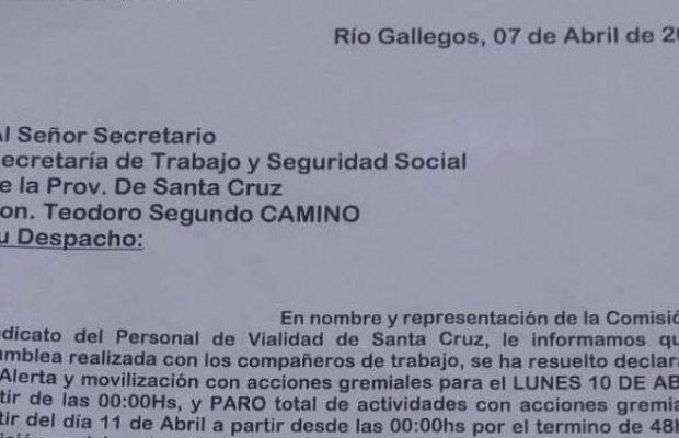 El gremio vial notificó a la Secretaría de Estado de Trabajo el paro que comenzará el lunes 10 con acciones sindicales y movilización y a partir del martes 11 paro general de actividades.