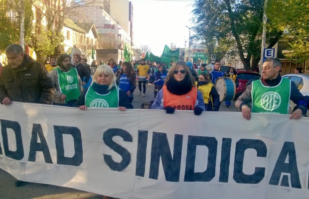 Trabajadores enrolados en los sindicatos ADOSAC, ATE, Viales, Judiciales, APROSA, de la agrupación Jubilados Unidos y del Partido Obrero llegaron este mediodía a la intersección de las calles Kirchner y San Martín con el fin de manifestarse, principalmente, en repudio por el pago desdoblado y fuera de término de sus salarios.