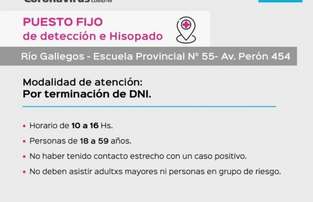 A partir de hoy domingo estará en funcionamiento el Puesto fijo de detección e Hisopado en la Escuela Provincial N° 55 (Av. Perón 454) donde pueden concurrir personas entre 18 a 59 años con sintomatología relacionada a covid19, que no sean contacto estrecho de un caso positivo.