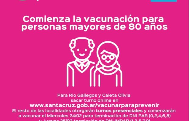 A partir de las 0 horas del día lunes 22 de febrero estará disponible la página para inscripciones de manera virtual para las localidades de Río Gallegos y Caleta Olivia; solamente para mayores de 80 años. Ingresar en https://www.santacruz.gob.ar/vacunarparaprevenir