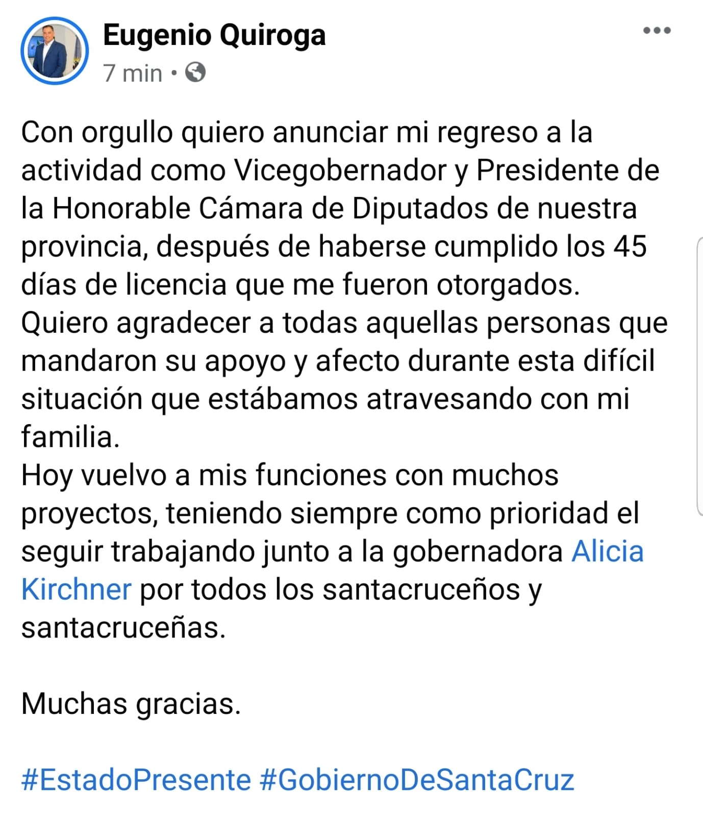 Tras dicha conferencia, esta mañana, y a través de sus redes sociales, Quiroga anunció que hoy lunes retoma su rol de vicegobernador con las tareas pertinentes que el puesto le demandan.