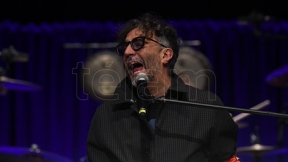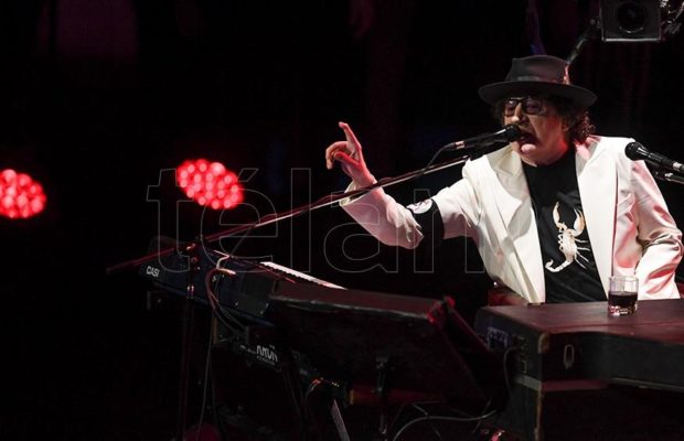 El gran rockstar argentino apareció sin aviso previo para cantar un rabioso “Cerca de la revolución”, al que siguió “Promesas sobre el bidet” y “Raros peinados nuevos”, en impagables versiones, en las que cantó sentado a los teclados.