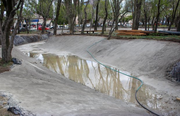 En el lugar, los obreros de la Dirección de Construcciones y Mantenimiento, que dependen de la Secretaría de Obras Públicas de la Municipalidad de Río Gallegos, trabajan en el encofrado de la estructura que sostendrá los puentes. Las tareas de hormigonado del suelo de lo que será este espejo de agua ya están casi concluidas, lo que muestra un gran avance en la remodelación de esta icónica plaza.