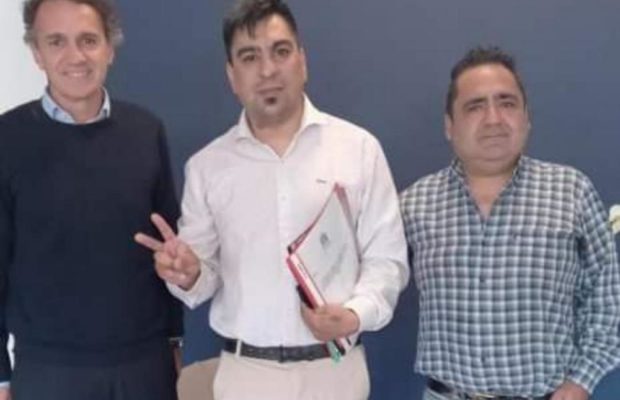 Fernando Omar Españon, acompañado del Secretario de Obras Arquitecto Cosme Bazán recibieron la documentación entregada por el Ministro de Obras de la Nación Gabriel Katopodis según detalle: saneamiento, cloacas y desagües pluviales para la localidad de 28 de Noviembre.