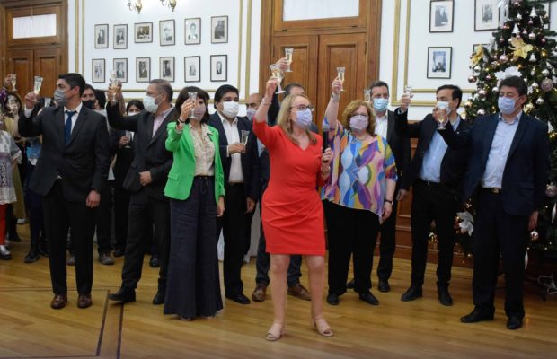 En horas de la tarde se realizó el tradicional brindis de fin de año que organiza el Gobierno Provincial. La actividad se llevó a cabo en el Salón Blanco de Casa de Gobierno y fue encabezada por Alicia Kirchner, a quien acompañaban el Intendente de Río Gallegos Pablo Grasso, ministros y ministras, autoridades y una gran cantidad de trabajadores de distintas áreas. Además, por videoconferencia, estuvieron presentes jefes comunales de todas las localidades provinciales.