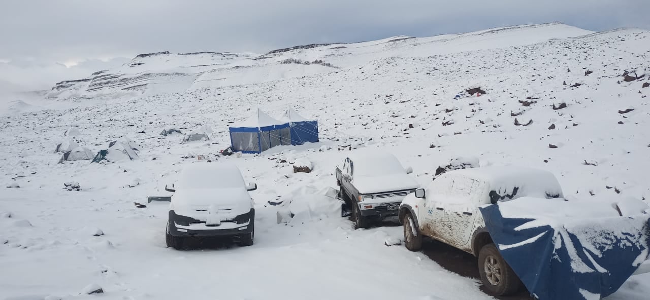 Este es el 4to viaje que se efectúa a lo alto de las estancias La Anita y Alta Vista, en donde asoman rocas que poseen los fósiles del Período Cretácico. La travesía desde El Calafate hasta el yacimiento debe efectuarse en camionetas 4×4, lo que toma unas 4 horas de manejo intenso, ya que no resulta de fácil acceso. El apoyo logístico del Sr Federico Braun, Facundo Echeverría y Daphne Fraser han sido indispensables para que el equipo arribara a la zona de trabajo. El campamento fue montado en lo alto de las barrancas que flanquean dichas estancias, lo que constituye una enorme ventaja debido a la proximidad a los sitios con fósiles. Sin embargo, las inclemencias del clima para la fecha elegida para la exploración se hicieron sentir, ya que los días fueron muy fríos, con lluvia y garrotillo, e incluso copiosas nevadas los últimos tres días que cubrieron el campamento, los vehículos y los asomos rocosos con los fósiles. Estas circunstancias hicieron que el viaje debiera finalizar unos días antes de lo previsto, aunque los fósiles colectados aseguran, afortunadamente, el éxito de esta reciente expedición.