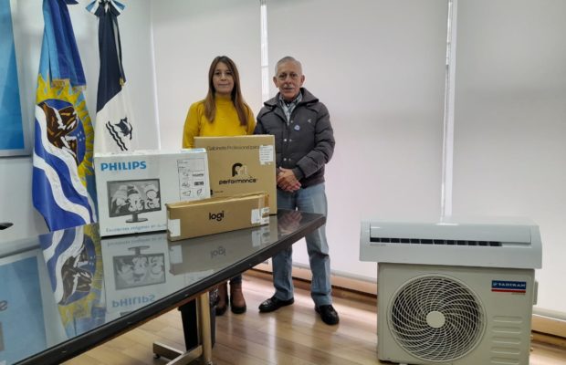 La Secretaria de Coordinación Ejecutiva del Municipio de Río Gallegos, Claudia Picuntureo, entregó hoy una computadora con sus accesorios y un aire acondicionado a Raúl Contreras, de la Asociación Sanmartiniana “Cruz del Sur”.
