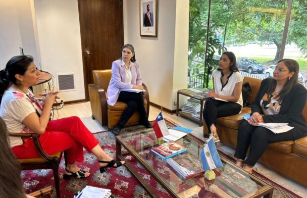 En el día de hoy, la secretaria de Estado de Empleo y Relaciones Laborales, Jessica Montiel; la subsecretaria de Gestión y Articulación de Políticas de Inclusión, Vanesa Franchello, del Ministerio de Trabajo, Empleo y Seguridad Social, junto a la subsecretaria de Cooperación Internacional para el Desarrollo, Ana María Cortés, dependiente de Jefatura de Gabinete, mantuvieron una reunión de trabajo con la Embajadora de la República de Chile, Bárbara Catherine Figueroa Sandoval y su equipo, a los efectos de dar continuidad a las líneas de cooperación detectadas durante el Comité de Integración Austral.