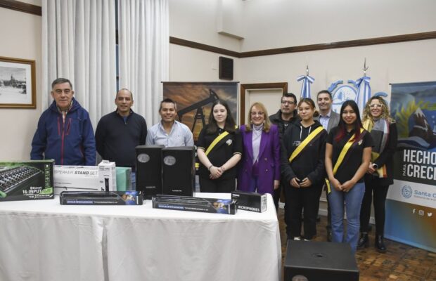 En la oportunidad, la Gobernadora se encontraba acompañada por el presidente de la empresa Fomento Minero de Santa Cruz Sociedad del Estado (Fo.Mi.Cruz S.E.), Esteban Tejada; y la gerenta general de la empresa estatal provincial, Débora Ocampo; e hizo entrega del equipamiento de sonido financiado por el Gobierno Provincial, a través de Fo.Mi.Cruz S.E.