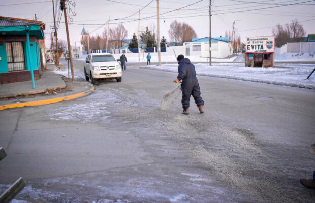 Personal de la Dirección de Obras Viales y del área de Limpieza Urbana, ambas pertenecientes a la Secretaria de Construcción y Ordenamiento Territorial, realizan todos los días un trabajo de relevo de las calles más complicadas por la presencia de hielo, y luego esparcen sal para disminuir la formación de escarcha.