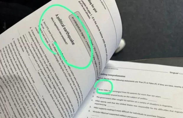 No sólo no es un texto de Oxford, sino que además incluye aspectos que despiertan polémica en torno a Milei. En el marco de un ejercicio donde los estudiantes debían poner verdadero o falso en función del texto inicial, había referencias al vínculo del Presidente con su hermana, la relación con sus padres y el nexo entre Victoria Villarruel y los represores condenados por crímenes de lesa humanidad.