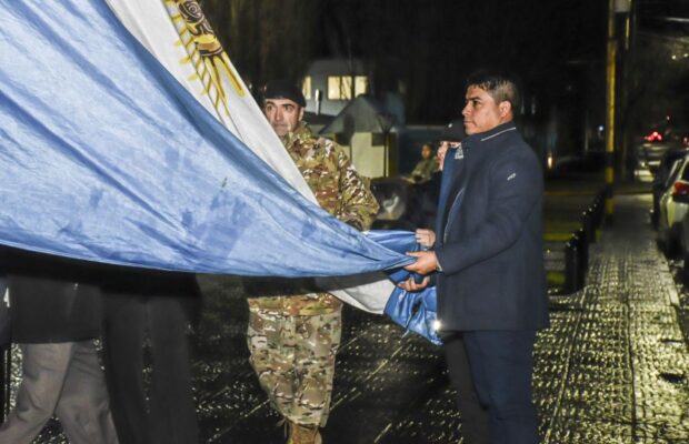 Nuestro pabellón nacional flameó bajo la melodía de Aurora interpretada por la Banda de Música Policial “14 de Noviembre”, recibiendo la formación una sección de la XIra. Brigada Mecanizada del Ejército Argentino y cadetes del Departamento Escuela de Cadetes.