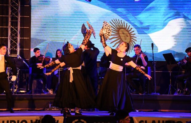 También subieron al escenario reconocidas agrupaciones folclóricas como Los Delgado, Sueño Andariego y La Toma, junto con artistas destacados como Alexis Prado, Ariel Arroyo, Juan Bracalenti, Rocío Ceballos, Noem y Claus Videla, quienes interpretaron una emotiva versión colectiva del Himno Nacional Argentino.