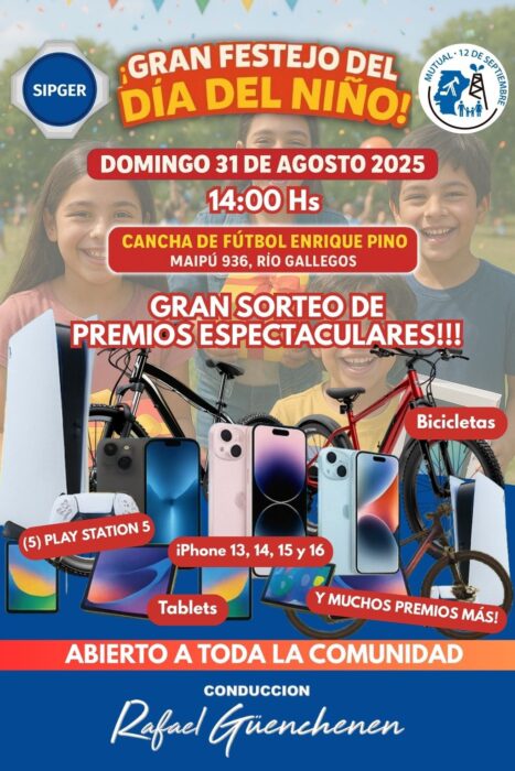 El evento organizado por SIPGER contará con una amplia propuesta recreativa que incluirá juegos, sorteos y espectáculos en vivo. Entre los premios más destacados se encuentran 5 consolas PlayStation 5, iPhones modelos 13, 14, 15 y 16, bicicletas de distintos rodados, tablets, además de muchos más regalos y sorpresas.