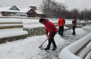 Maquinaria vial realizar tarea de despeje de nieve en la ruta 11 dentro del PN Los Glaciares, mientras personal del ICE limpian los accesos peatonales...